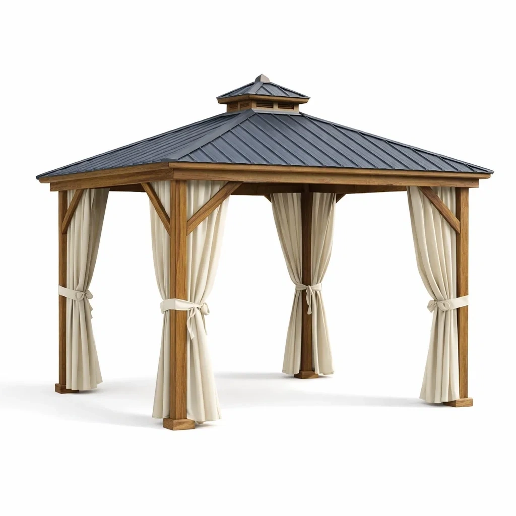 Pavillon bois avec toit en métal et rideaux en polyester