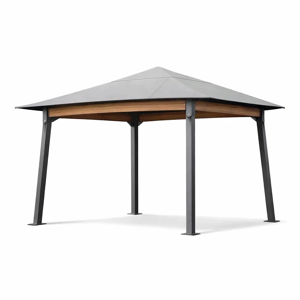 Pavillon extérieur aluminium et acier avec toit en bardeaux et bois