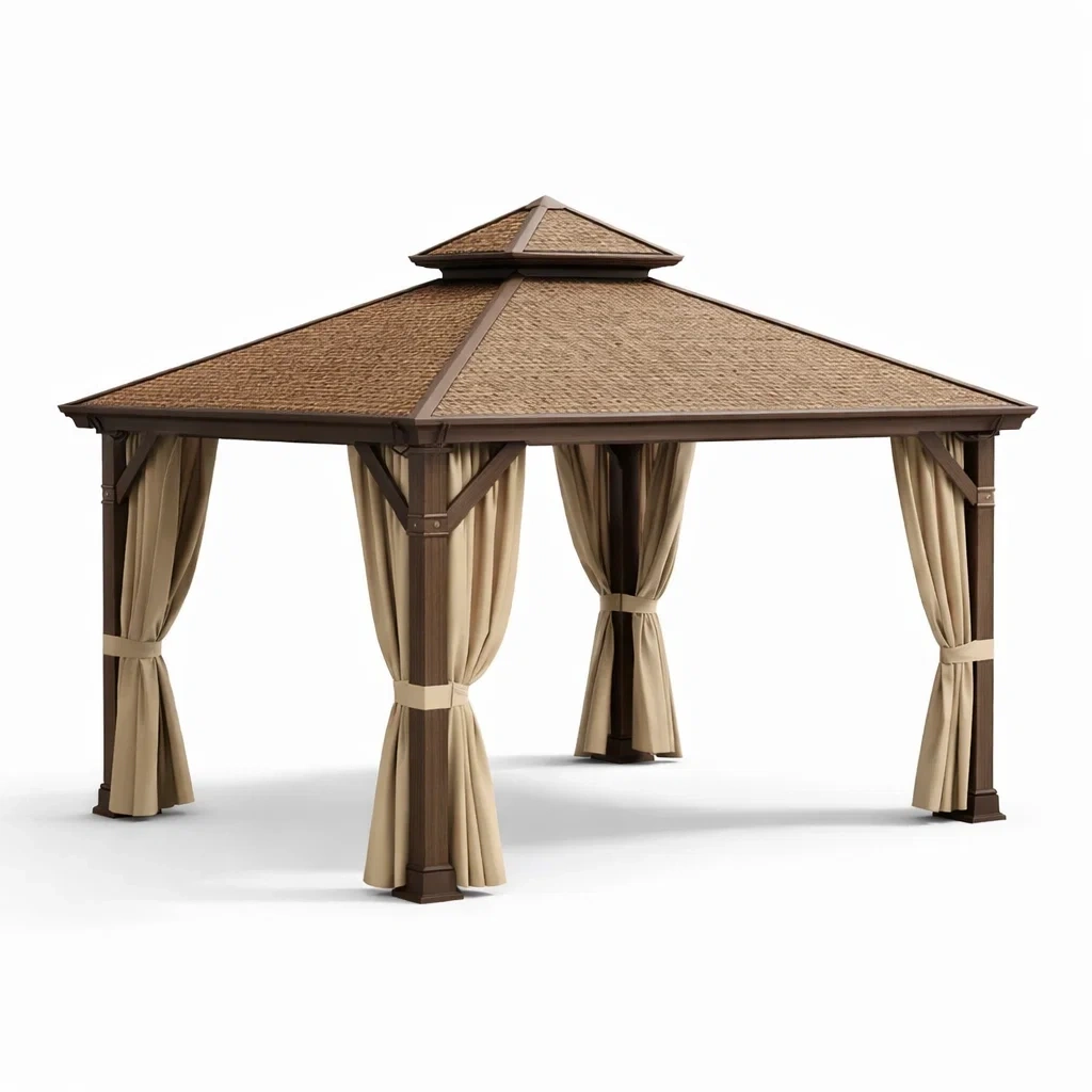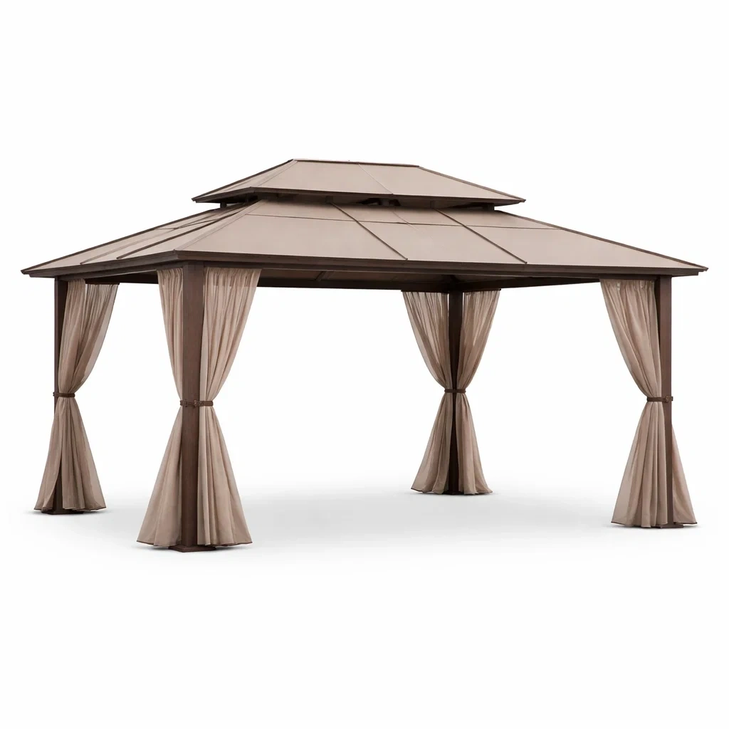 Pavillon aluminium marron avec double toit et rideaux en polyester