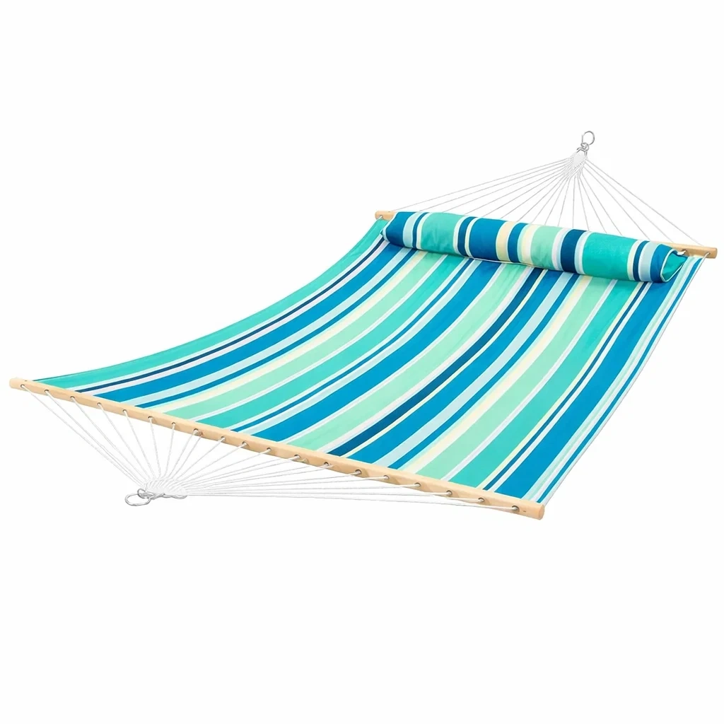 Hamac en toile de polyester avec barres d'écartement en bois de sapin.
