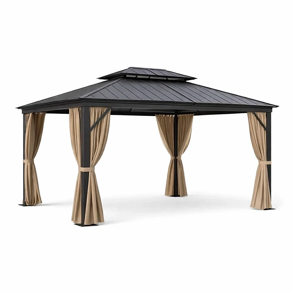 Matériaux : Structure en acier résistant, toit en aluminium, rideaux en polyester beige.