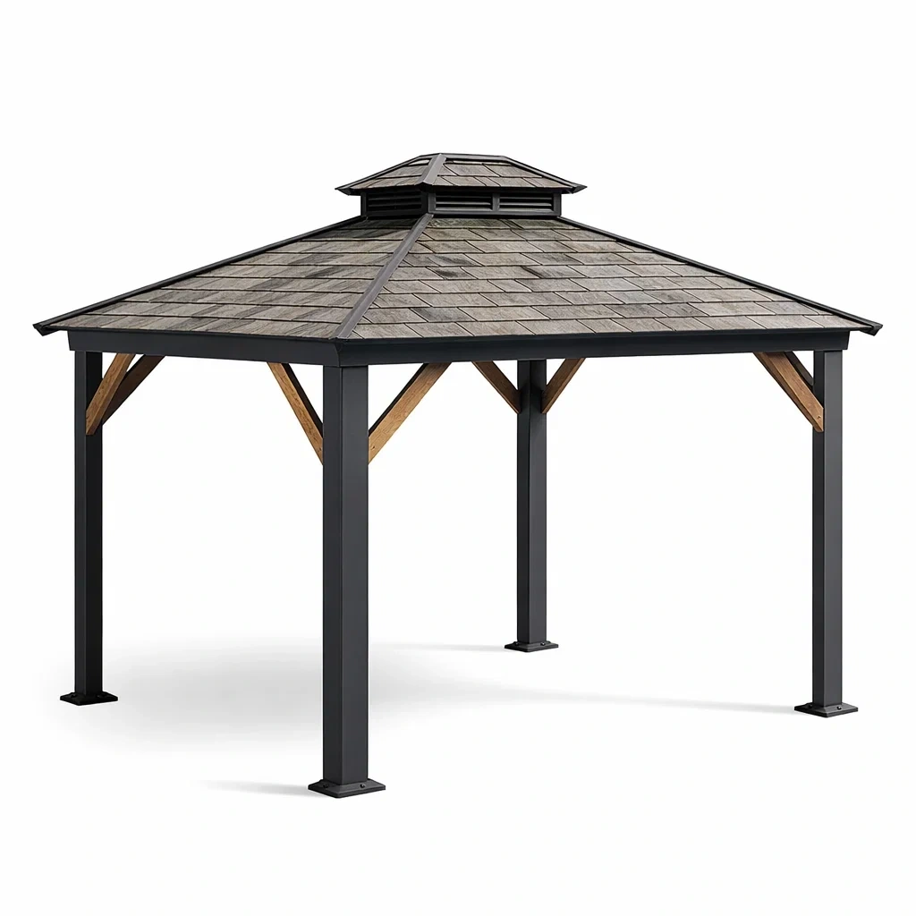 Matériau: Structure en aluminium, sections en bois, toit en bardeaux